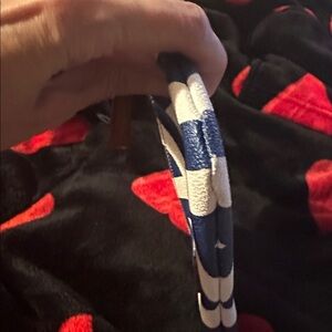 DOONEY & BOURKE clutch/ make up bag with navy and white chevron design. Ideal for carrying essentials. Used as a make up bag it came with my Dooney and Bourke shopper purse, my iPhone 16 fits with a lipstick and a few cards that lay flat. One corner had a run I photographed it