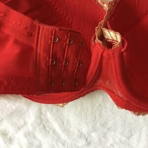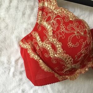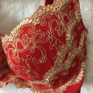 Experience luxury with this elegant red bra featuring exquisite gold lace detailing. Perfect for adding a touch of sophistication to your intimate collection.