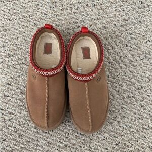 Warm brown slippers with cozy red accents. Ideal for comfort and style.