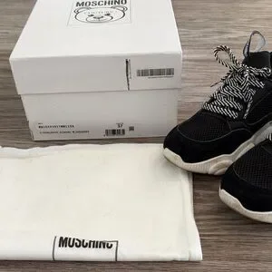 Chic Moschino sneakers with black mesh and white accents. Perfect for casual wear. In very good condition! Worn not even a handful of times. Includes box and dust bag! Offers are welcome. Thank you!