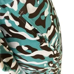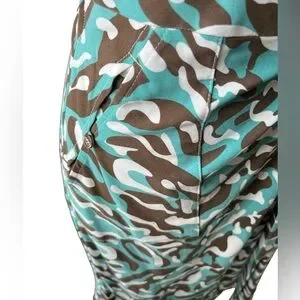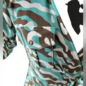 This version of the iconic wrap dress has all the bells and whistles! Rolled tab sleeves, chest pockets and side slash pockets, plus a unique and attractive color scheme! A lovely teal blue and brown camo print that you don’t see often.