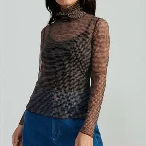 Fonda Turtleneck in Pistachio/Vino by The Great Eros. Fitted turtleneck in a sheer mesh with pearled edge hemline. This seasonal geometric print was adapted from a hand drawn printmaker in their archive from 1972. In rich fall hues of pistachio and vino, this will surely become a staple of the season.