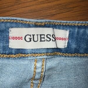 Stylish Guess jean shorts. Frayed hem. Classic five-pocket design. Perfect for casual wear.