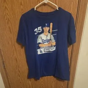 Fanatics Los Angeles Dodgers Cody Bellinger 2019 NL MVP shirt. The color is blue. It's a size L men's. It's gently used and in excellent condition. No holes, rips, stains, etc. Materials are 100% cotton. Measurements: top to bottom is 28" and across from pit to pit is 21".