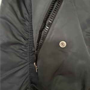 Original Acne Studios bomber jacket coat. Women’s Clea puffer, model PAW17. Black nylon, polyester, viscose blend. Mid length with heavy duty zipper pockets and full zip length. Washable. Sz 42, equivalent to XL large.