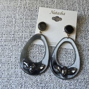 Chic teardrop earrings by Natasha Couture. Features a sleek gray and black design with sparkling accents. Ideal for elevating any look. Approximately 4" in Length.
