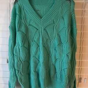 Stay cozy and stylish with this teal cable knit sweater. Perfect for layering in cooler weather.