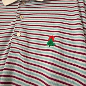 Classic polo with red and white stripes. Features a white collar and embroidered Burning Tree Club logo. Perfect for casual wear.