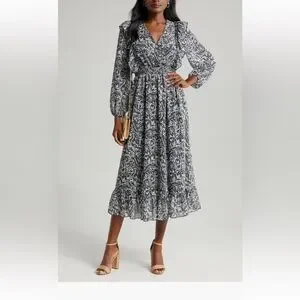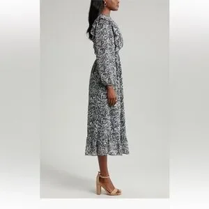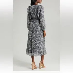 Sam Edelman Navy Wallpaper Paisley Smocked Waist Long Sleeve Dress NwT