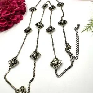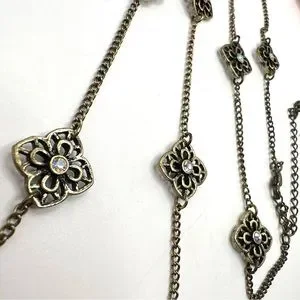 Absolutely Stunning Fabulous Vintage Premier Designs Antiqued Golden Long Chain Linked Necklace With Beautiful Double Sided Floral Charms Embellished With Aurora Borealis Crystals. Well Made & Sparkly! Unique Design