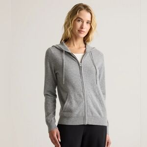 Ultra-soft Quince zip-front hoodie crafted from 100% Grade-A Mongolian cashmere. Lightweight yet warm with a smooth knit finish, ribbed cuffs/hem, and metal-tip drawstrings. A minimalist luxury staple perfect for layering year-round.