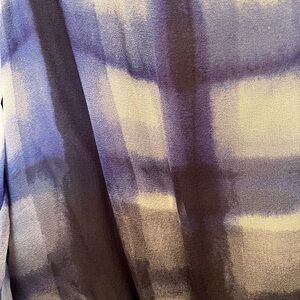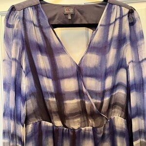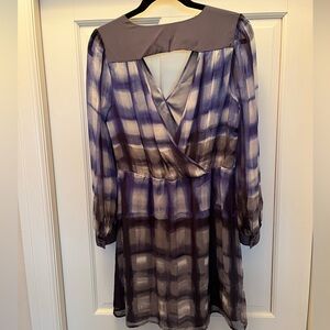 Cusp by Neiman Marcus blue & gray check print crossover silk mini dress. Sheer sleeves, slip under the body of the dress. Clasp at V-neckline. Size medium. 100% silk. Barely worn, good condition.