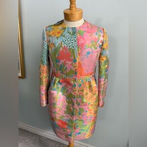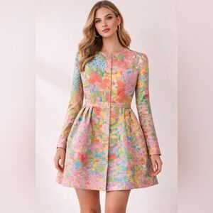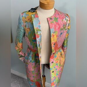 Stunning Boutique Moschino designer dress, brand new with tags and made in Italy, featuring an extraordinary painterly floral print in vibrant pink, coral, blue, green, and golden tones. This structured silhouette showcases Moschino’s signature artistic aesthetic — bold, collectible, and unmistakably runway inspired. Crafted with a beautifully tailored bodice, softly structured waist, and refined long sleeves, this piece feels like wearable art and makes a standout choice for events, gallery openings, weddings, or luxury resort evenings. Details: Brand: Boutique Moschino Made in Italy New with tags Original retail approx. $1,800 Size: USA 12 Pit to pit: 20" Waist: 18" Length: 33" Structured silhouette with tailored waist Fully lined interior Vibrant signature Moschino floral artwork print A collectible designer statement piece that instantly elevates any wardrobe.