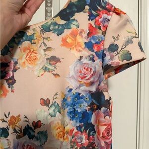 Betsey Johnson floral roses flowers beige blue orange pink gold dress size 12