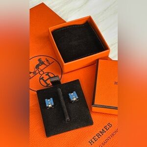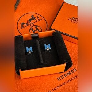 Authentic Hermès blue H Cube stud earrings featuring crisp white enamel with palladium-plated hardware. A timeless and elegant everyday piece showcasing the iconic Hermès “H” design.