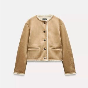 Elegant camel jacket with button closure. Soft teddy texture. Ideal for layering.