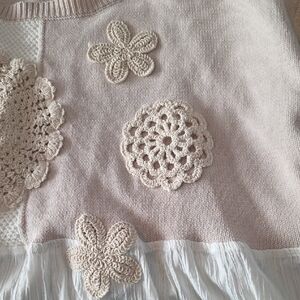 Elegant knit top with cream and white patchwork appliques. Soft texture and style. gauze and knit. so so so good! just too big for me.