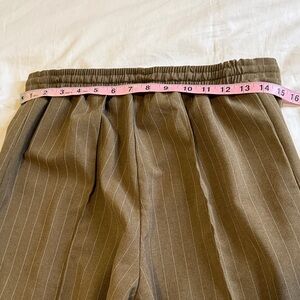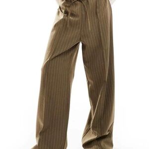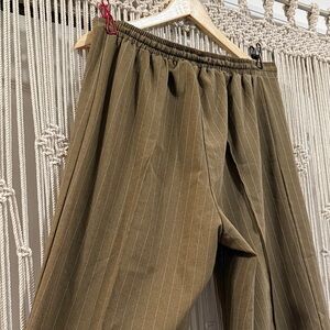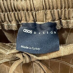 ASOS DESIGN olive green wide-leg pants with pinstripe design. Features a drawstring waist and elastic in back for comfort. Pre-loved, like new in great condition. Has four panels that make up the front and four in the back with very defined crease lines.