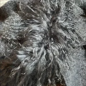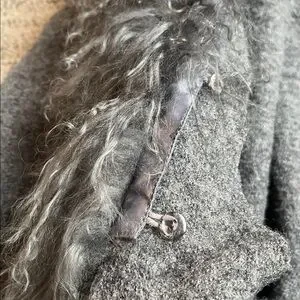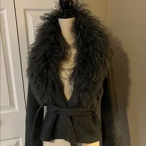Stylish gray jacket featuring a luxurious real lamb fur collar. Perfect for adding elegance to any outfit. Wool grey jacket, attachable fur collar! Fits medium USA woman!