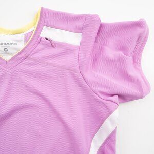 Brooks women's Revelation Tee pink/yellow athletic running shirt with Brooks Equilibrium Technology, hidden left shoulder pocket