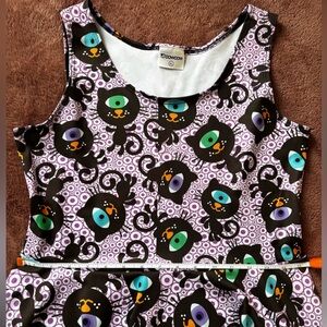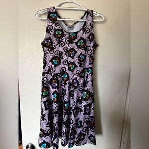 Super cute CowCow sleeveless skater dress featuring an allover black cat print with colorful eyes on a purple geometric background