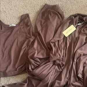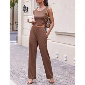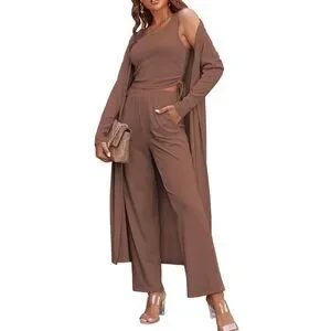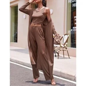 The ultimate comfortable and chic 3-piece set in rich Brown, Size Small (S). Features a long-sleeve open-front cardigan, a scoop neck crop tank top, and elastic high-waisted wide-leg pants. Perfect for travel, airport outfits, cozy loungewear, or wearing as separates. Soft, breathable, and highly stretchy tabric.