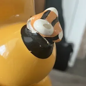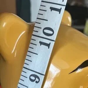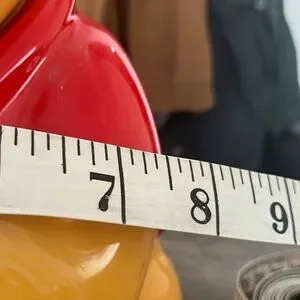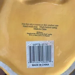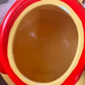 Charming Winnie the Pooh cookie jar in bright yellow and red. Perfect for adding a touch of whimsy to your kitchen. Has a small crack on the nose, had to be glued back on, but other than that in excellent condition.