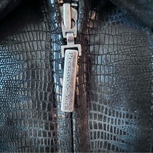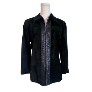 This black suede jacket by Preston & York is a stylish addition to any wardrobe. Made of 100% genuine leather, it features a full zip front and snakeskin trim on front, lined, 2 pockets.