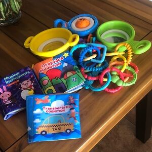 Engage your child with this vibrant toy set featuring colorful rattles and educational books. Perfect for stimulating cognitive development and sensory play.
