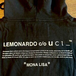 New with tags UrbanCooLab Lemonardo Moona Lisa black hoodie. A blen of modern conceptualism and a renaissance astronaut aesthetic. Hexagonal drawstrings at hood. Graphic prints on chest, back and arms. Fitted Kangaroo pocket at waist.