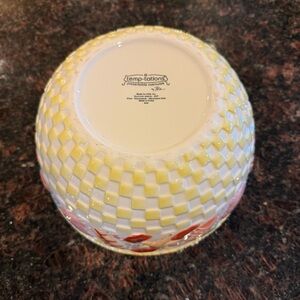 Beautiful Temp-tations Presentable Ovenware by Tara 3-quart serving bowl in the cheerful Summer Shells pattern (yellow checkered border with raised shell design).