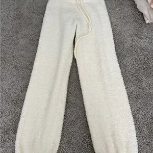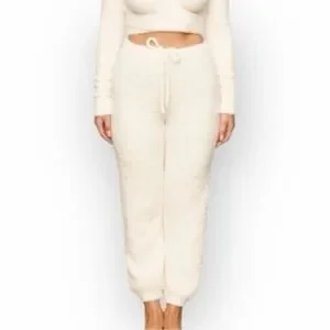 Soft and fuzzy knit joggers in a cozy cream color. Perfect for lounging.