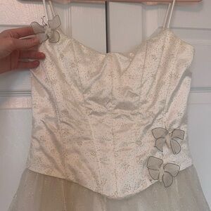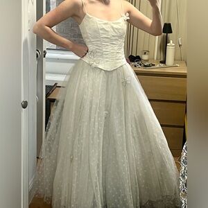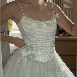 Jessica McClintock Gunne Sax ethereal white ball gown. Gorgeous vintage style. Corset satin top and full Tulle skirt. Spaghetti strap dress. Butterfly appliques on skirt and on top. Bodice has boning to hold shape. Multiple layers of tulle. Puffy dress, perfect for prom night. Back zipper.