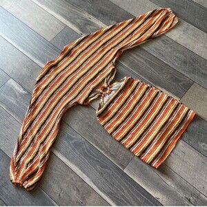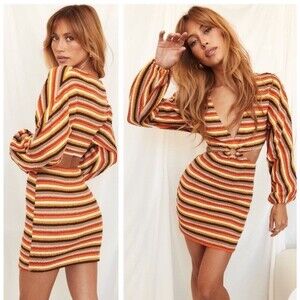 BRAND NEW WITH TAGS! -multi knit crochet mini dress - lined - v-neckline - o-ring detail attaches top piece and bottom piece - balloon sleeves - elastic waist - Runs true to size - Approximately 32" from shoulder to hem - top is approximately 12" shoulder to ribcage - skirt is approximately 18" waist to hem - sleeve is approximately 26" shoulder to hem - shell: 90% acrylic 6% spandex 4% Polyester - lining: 100% polyester - hand wash cold - runs true to size. Size Small