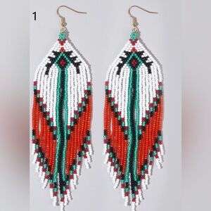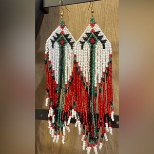 These beaded dangle earrings feature a striking combination of red, green, black, and white beads. Perfect for adding a touch of sophistication to any ensemble.