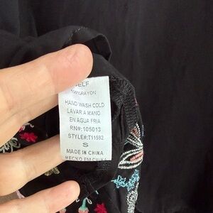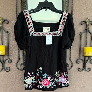 Chic floral black top with vibrant floral embroidery. Square neckline. Perfect for casual or dressy occasions. New with tags. Size small