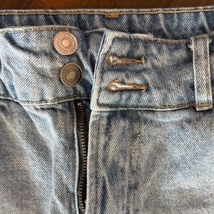 Stylish light blue distressed jeans for women. Perfect for a casual look.