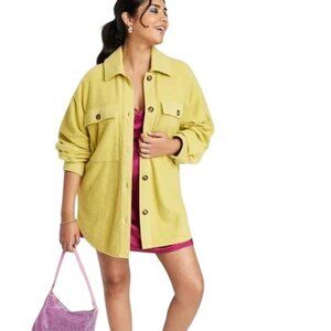 Stylish Wild Fable women's button-up shirt jacket in vibrant yellow. Crafted from a soft cotton blend with dual chest pockets, button cuffs, and an oversized fit design.