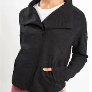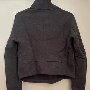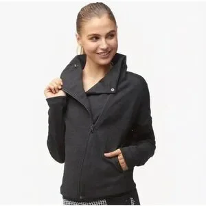 Comfortable dark gray hoodie with subtle texture. Slightly cropped style, asymmetrical zipper. Snap button closure on collar. Never worn.