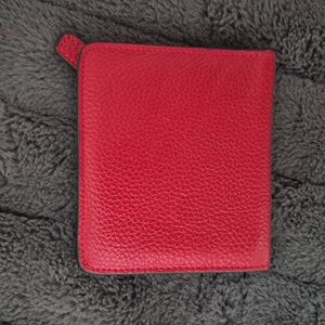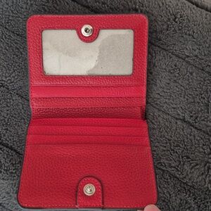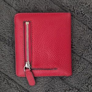 Red Cowhide leather small wallet. This is unbranded, but is a beautiful wallet. It has multiple card slots, ID slot, room for bills, and change. Very lightweight. Cardboard still in ID slot. Approx measurements in photos. New; never used.