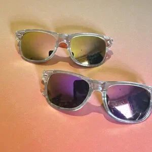 Fashionable sunglasses featuring clear frames and vibrant mirrored lenses. Ideal for a chic look.