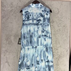 Chic sleeveless jumpsuit with button-down front. Features a blue tie-dye design. Ideal for summer wear.