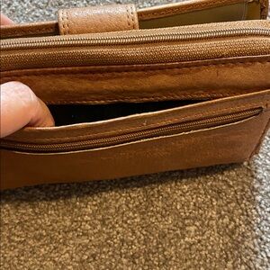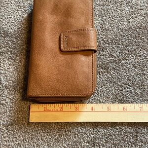 For sale is this women’s wallet. This wallet is from the Rolfs brand and it is made of genuine leather. It is a tan color and measure 7 inches across and 4 inches high. It is roughly 1.25 inches wide without anything in it.