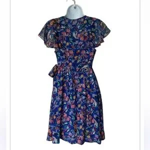 Anthropologie Moulinette Seours wrap dress in blue floral print. V neck and flutter sleeves. Fully lined. 100% silk chiffon. Bust 16” waist 12” length 34”. Excellent condition. Size 0