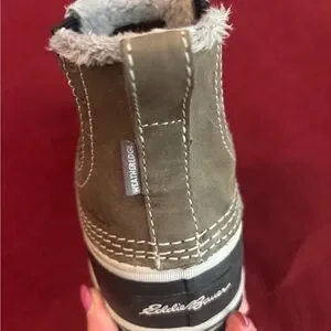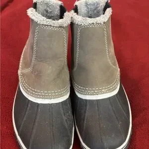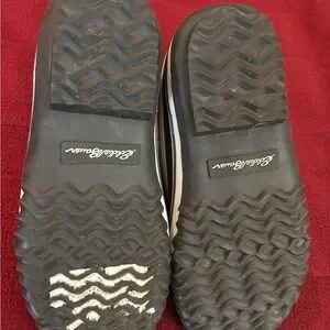 Chic boots featuring black and gray tones. Accented with white stitching for a stylish look. The sides have elastic to make it easy to get in. Small strip of fur on top but not inside. These shoes are great for rain and snow! From Edie Bauer, a popular brand. Size 8