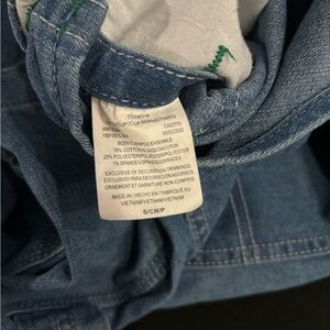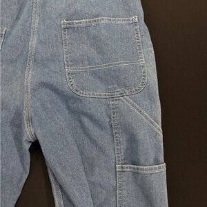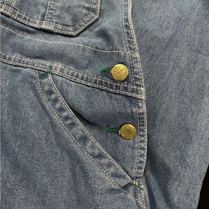 Classic blue denim overalls by Liberty. Never been worn. Features green stitching and gold buttons. Ideal for everyday wear.