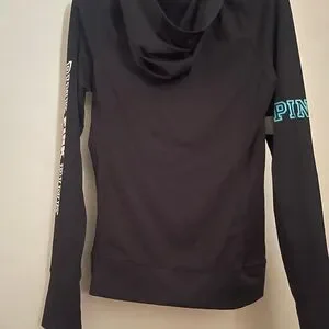 Lightweight black varsity style hoodie. The only thing wrong with it is that it’s missing the string that goes through the hood. All appliqués and logos on the hoodie and the fabric itself are still in amazing condition.