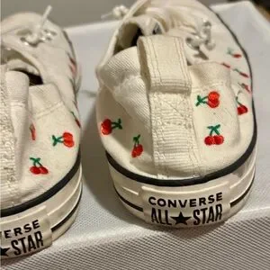Charming Converse sneakers with cherry accents. Classic white canvas. Ideal for playful style. These were worn a few times but have a ton of life left. I just never wear white shoes.