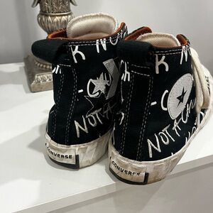 “Not a Chuck” Converse Stylish high-top sneakers with bold text design. Features black and white colors with cream laces.