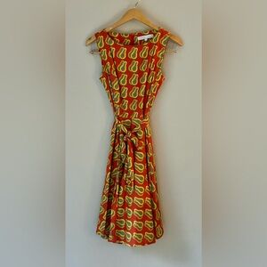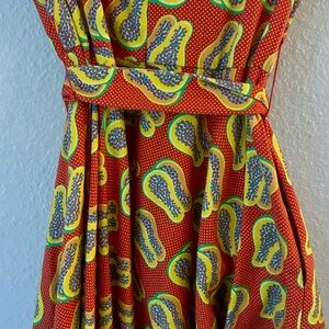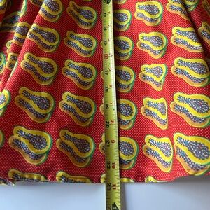 Miss Lulo Retro Red Tropical Papaya Print Sleeveless A-Line Swing Dress, Women's Size Small. This vibrant dress features an all-over papaya fruit print on a red polka dot background. Design includes a classic sleeveless silhouette, A-line swing skirt, and a matching fabric tie belt to cinch the waist. Perfect for summer parties, tropical vacations, or retro-inspired everyday wear. Excellent pre-owned condition with no visible holes, stains, or flaws. Features a rear zipper and hook-and-eye closure.